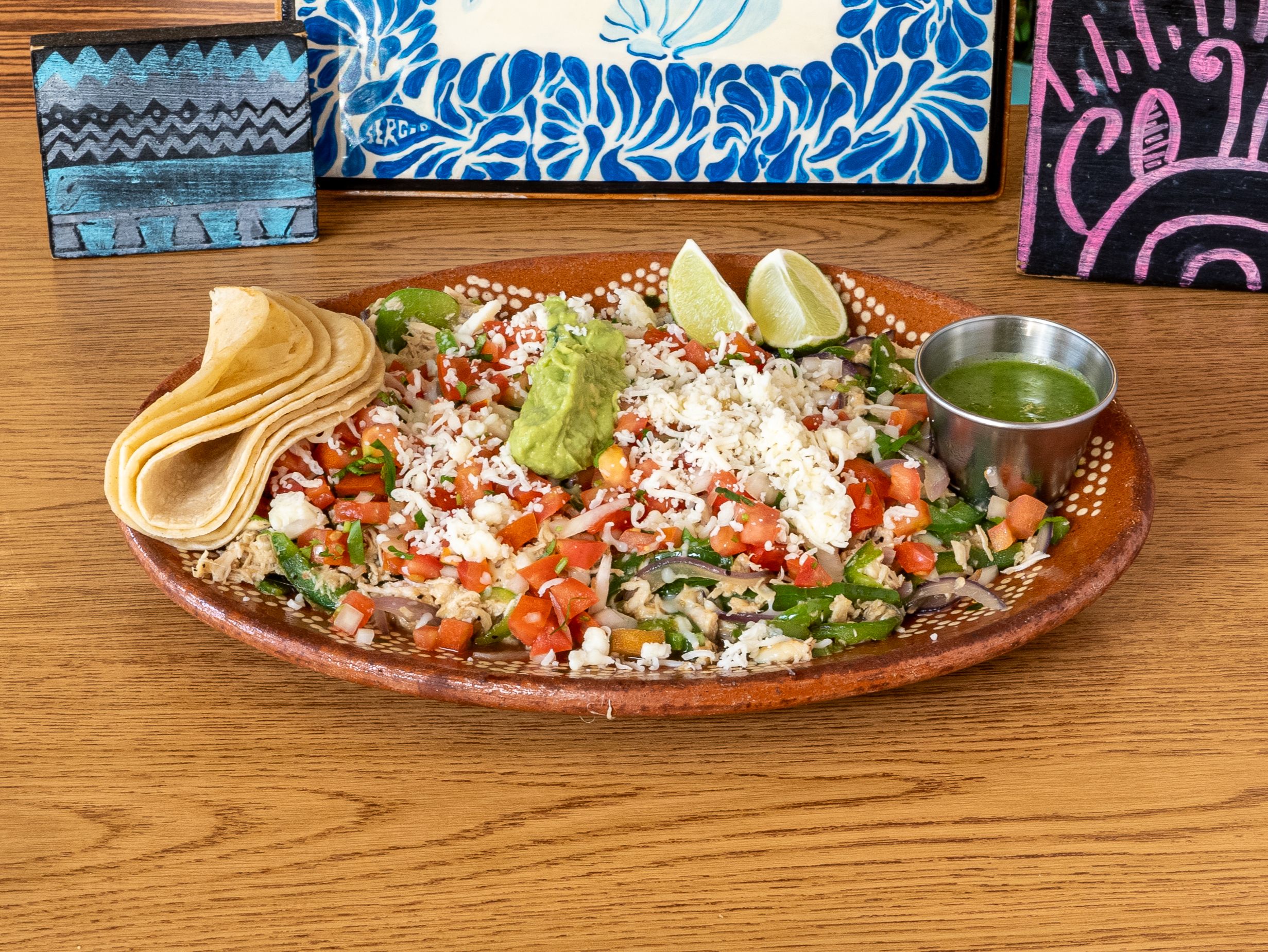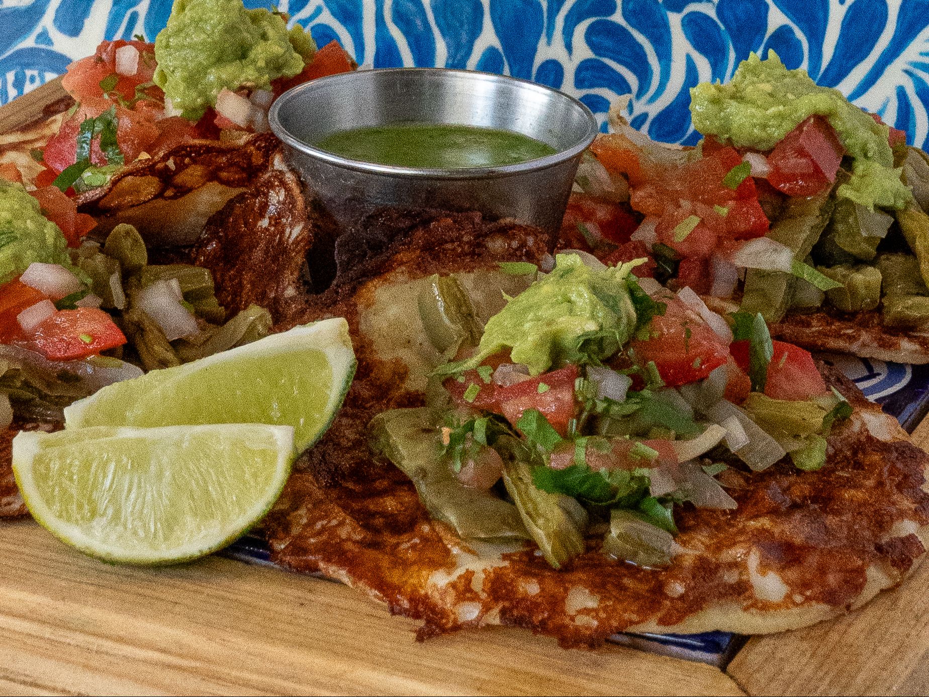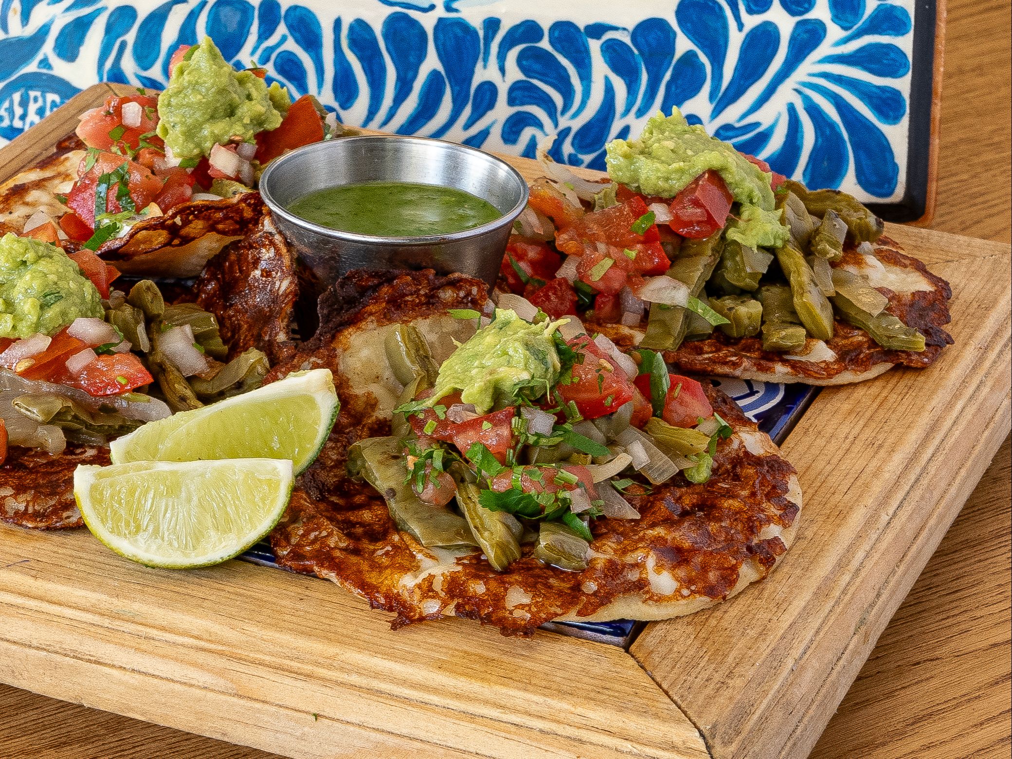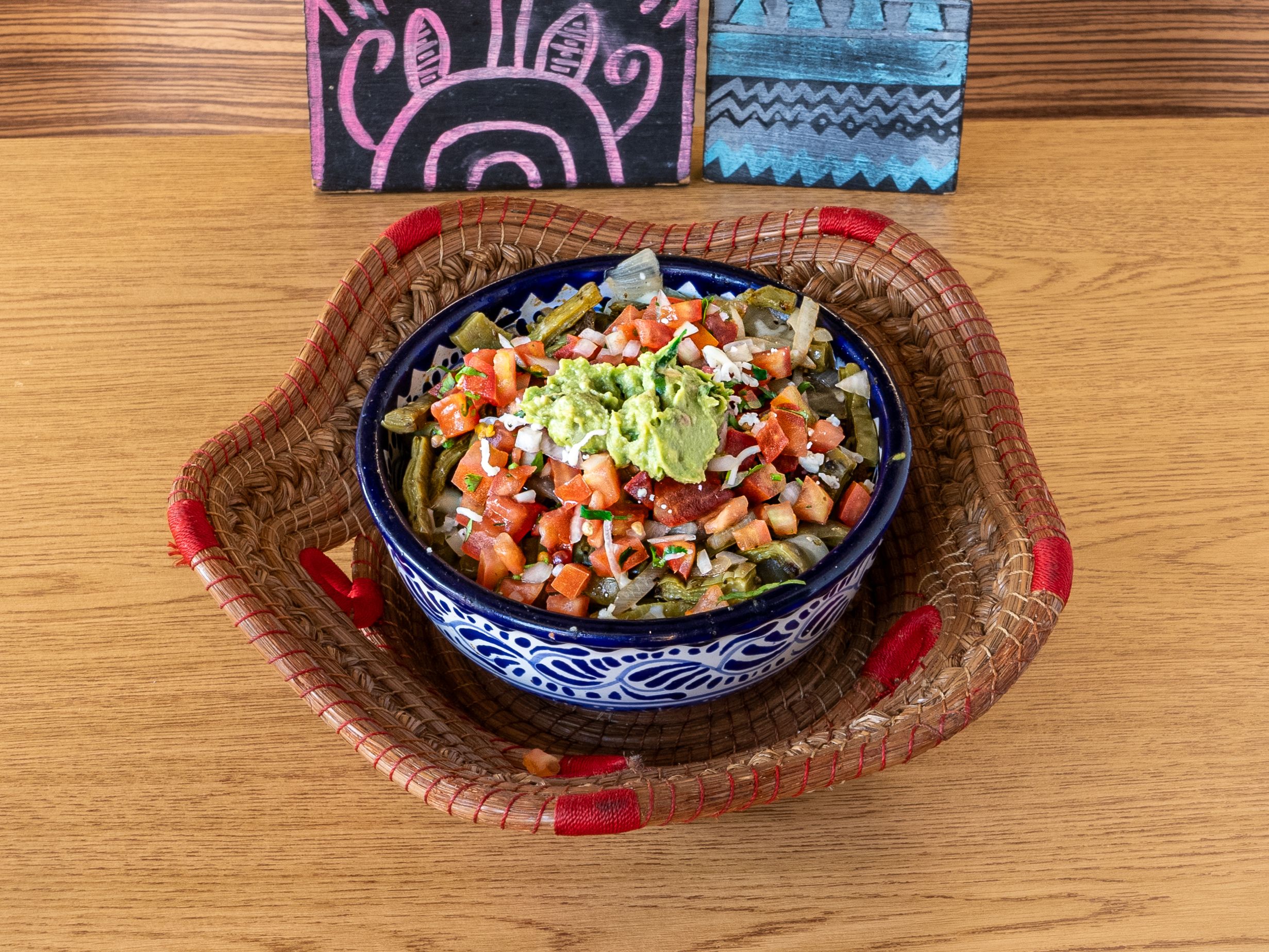 Grilled cactus paddles with a fresh, tangy bite. A traditional and satisfying vegetarian option, served over crispy chips topped with melted cheese, beans, pico de gallo, and guacamole for a full, satisfying meal.
