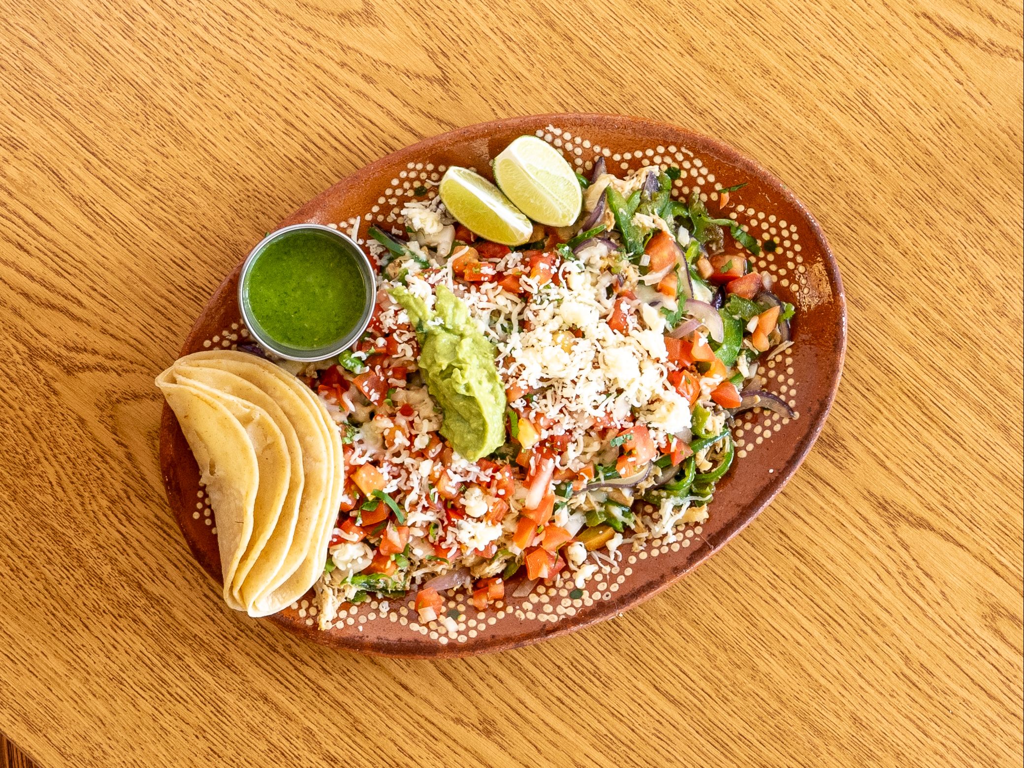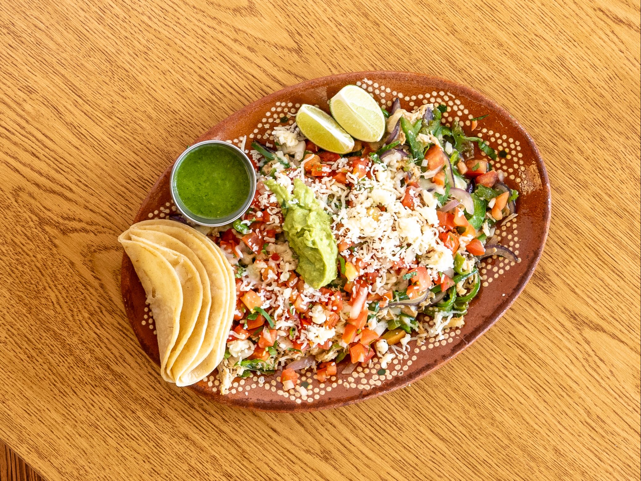 Shredded chicken in rich, savory mole poblano. A comforting and traditional flavor from central Mexico. Skillet-grilled platter with sautéed bell peppers, onions, and shredded cheese. Served with tortillas on the side.