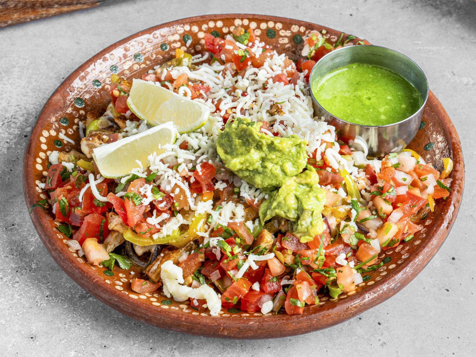 Slow-cooked pork short rib with a smoky BBQ glaze. Deeply savory and satisfying. Skillet-grilled platter with sautéed bell peppers, onions, and shredded cheese. Served with tortillas on the side.