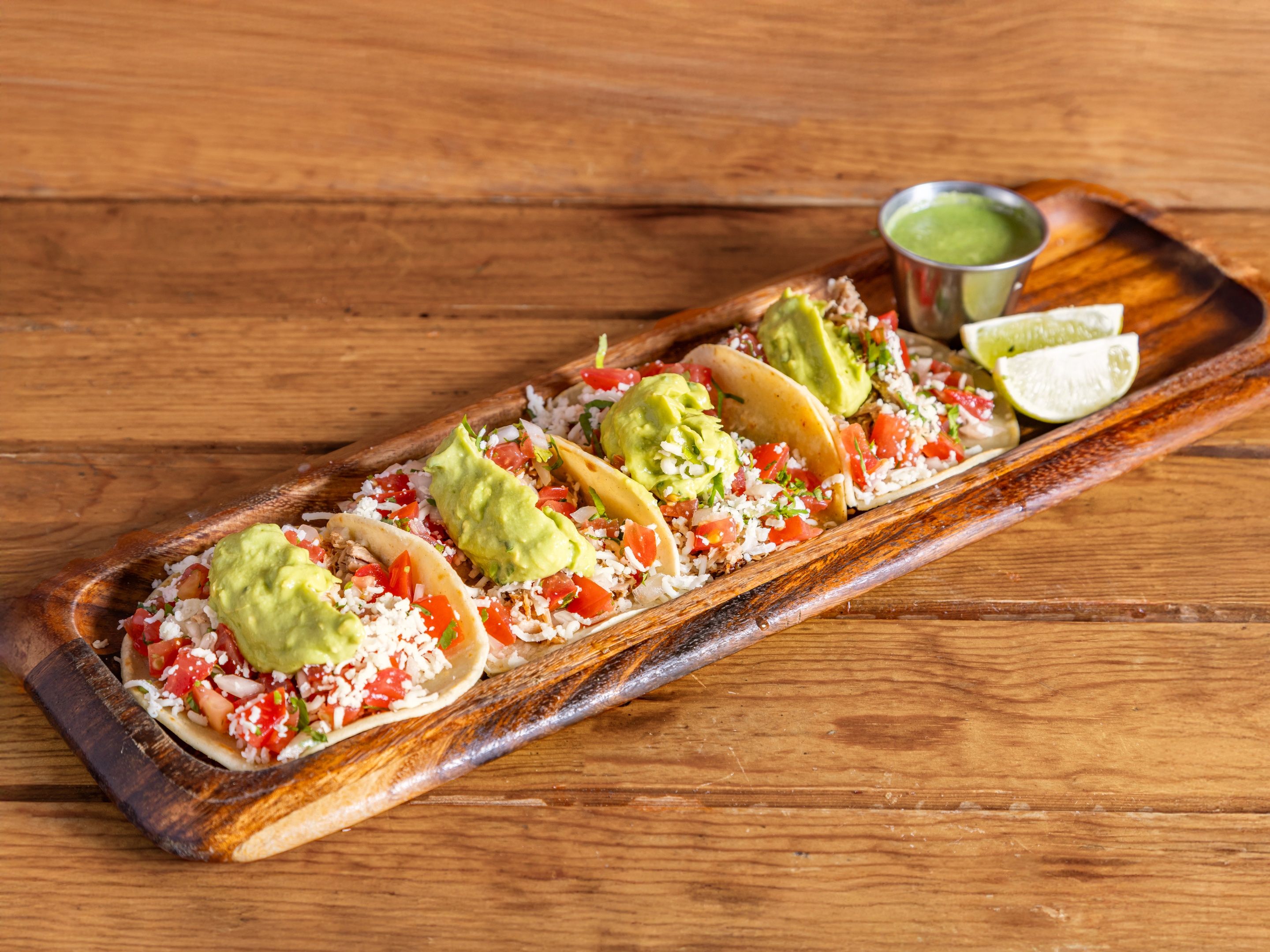 Shredded chicken in rich, savory mole poblano. A comforting and traditional flavor from central Mexico. Corn tortilla taco loaded with melted cheese, guacamole, pico de gallo, and chipotle cream on the side A flavor-packed, hearty bite.